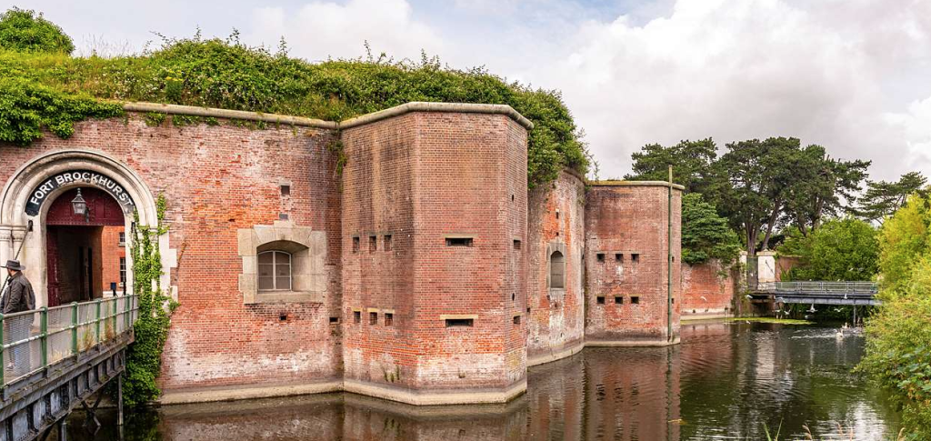 Fort Brockhurst was built in the mid 19th century to protect Portsmouth and its harbor. The officers’ mess has its original chimneypiece, in the style of an earlier Regency design.